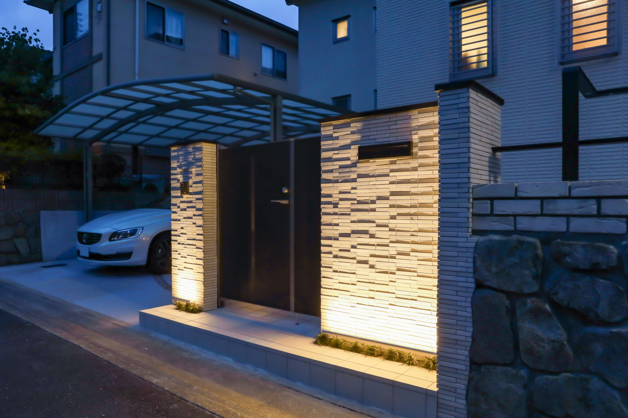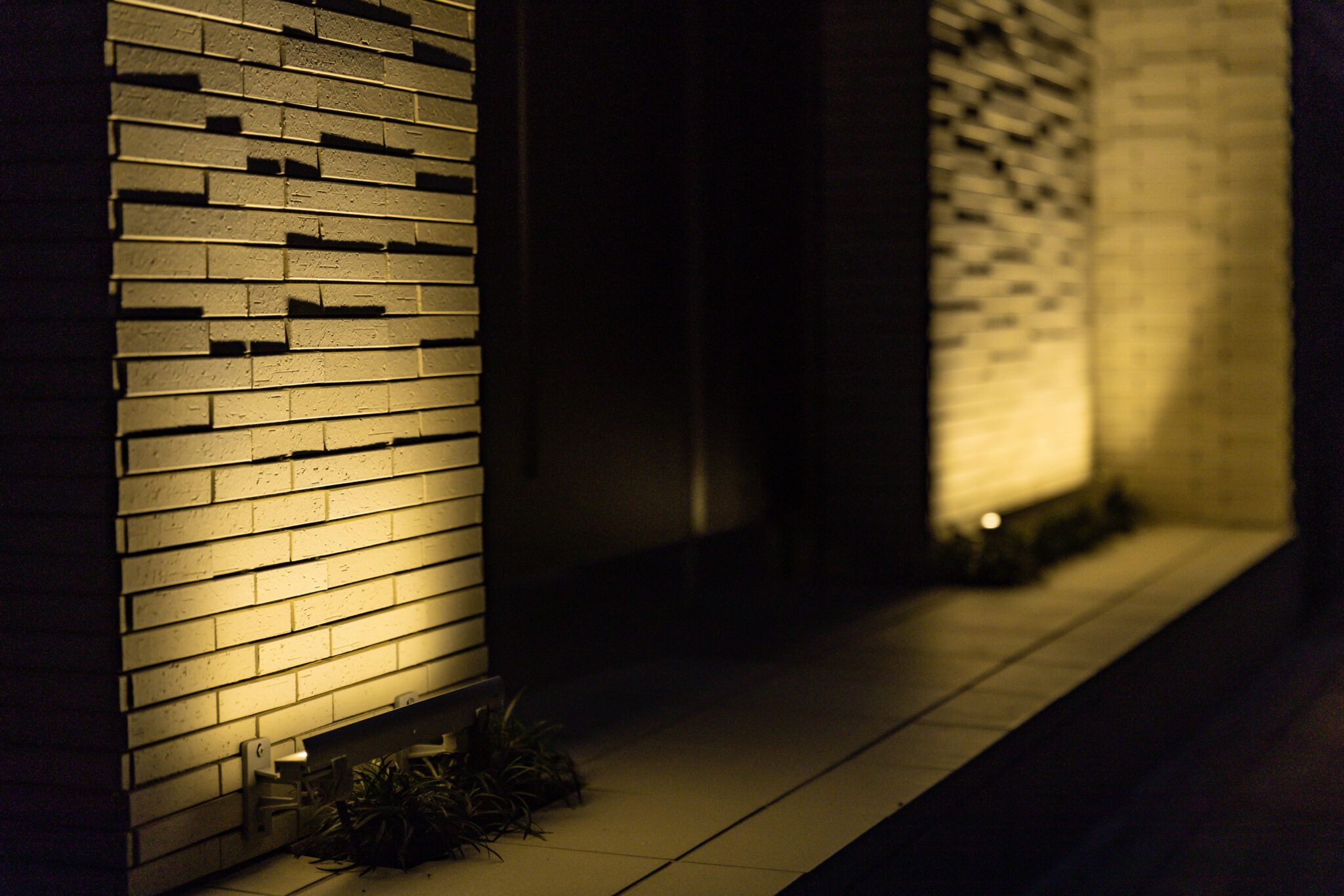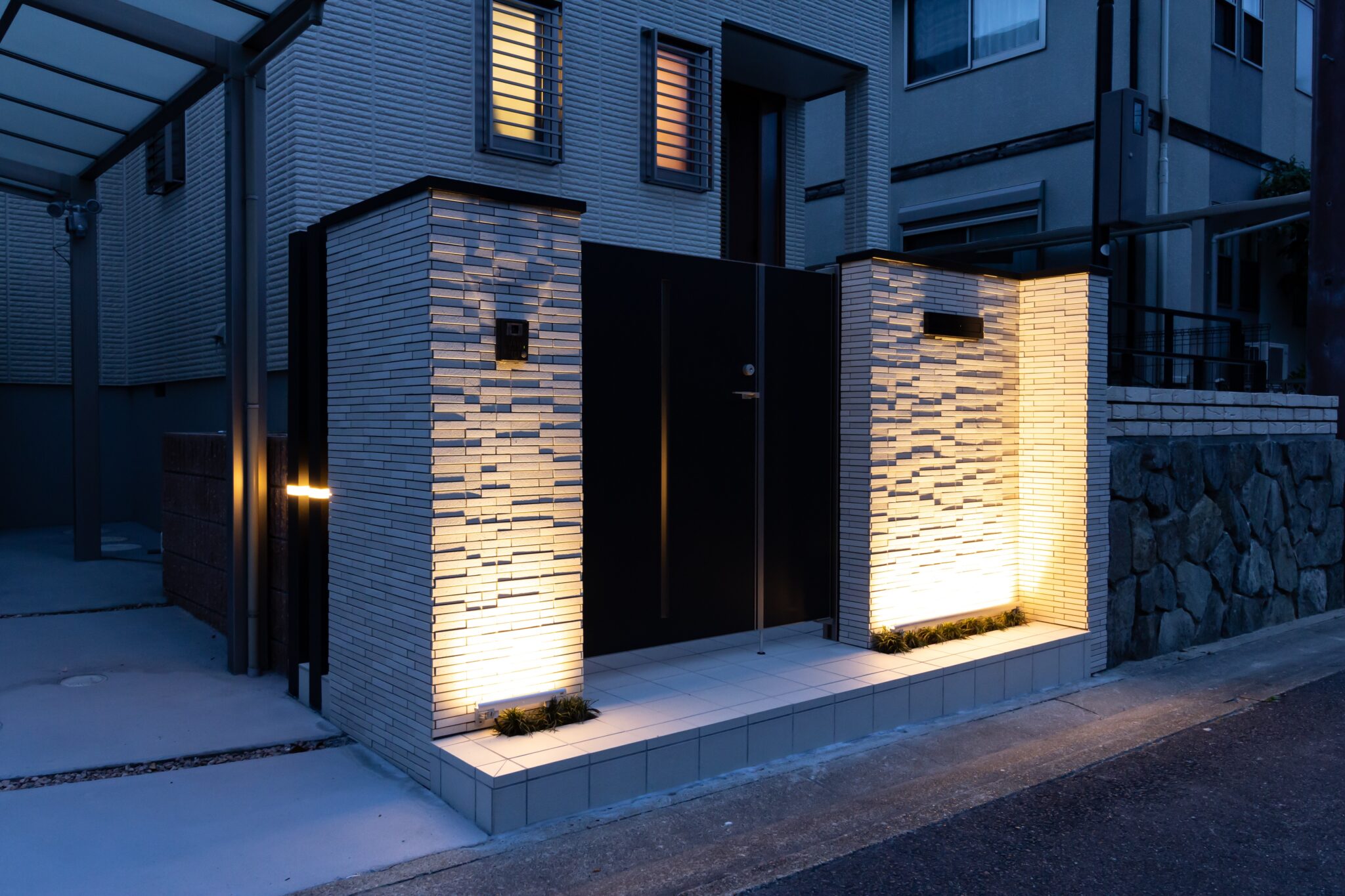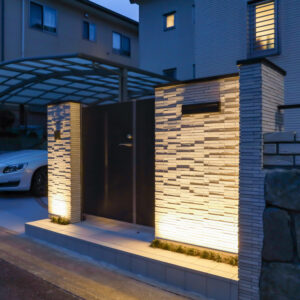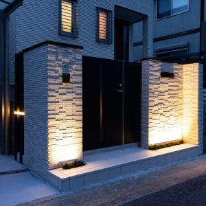 夜は門袖の足元に配置したバー型の細長いウォールアップライトが、壁面全体を優しく照らし、タイルの凹凸を美しく際立たせてくれます。