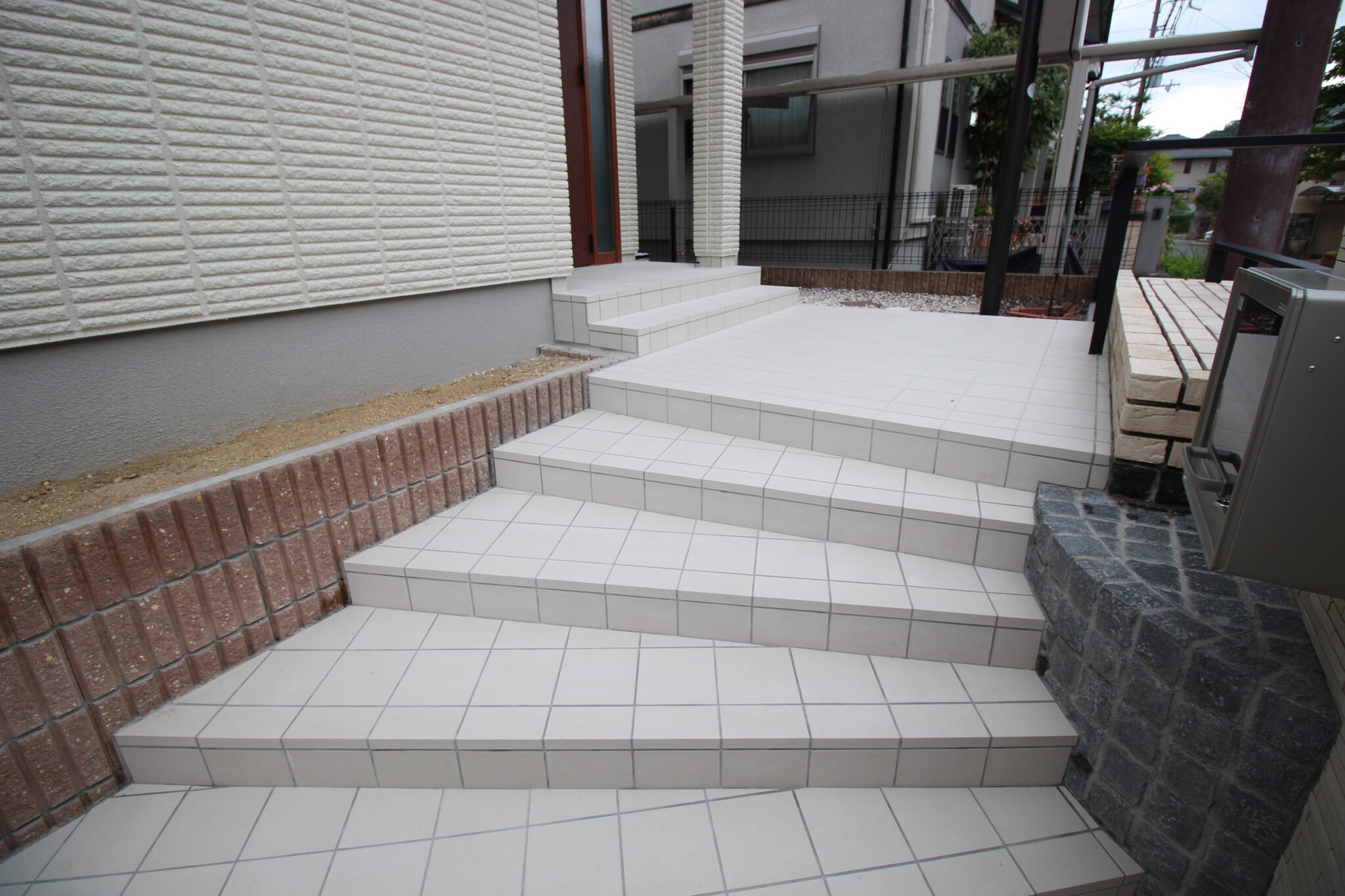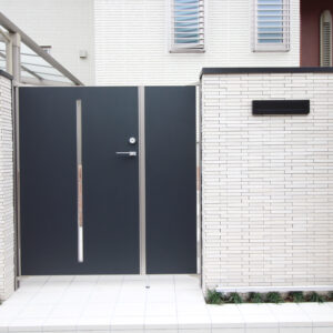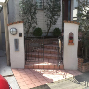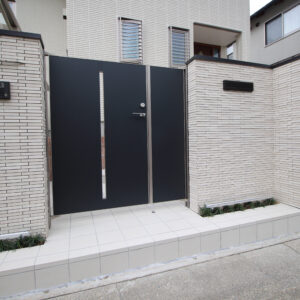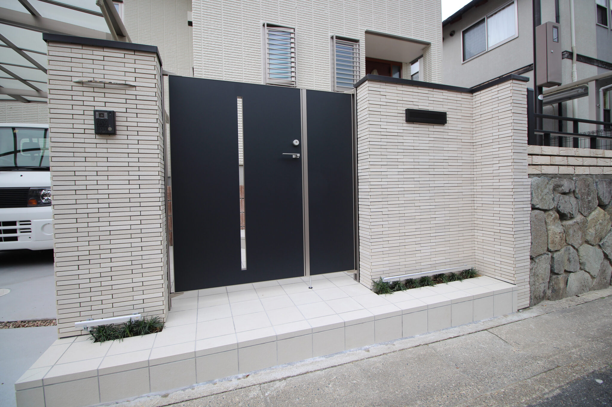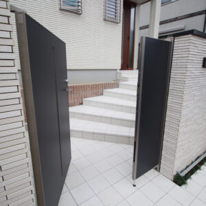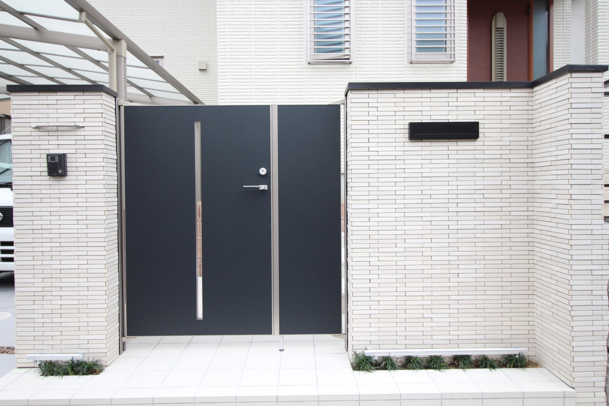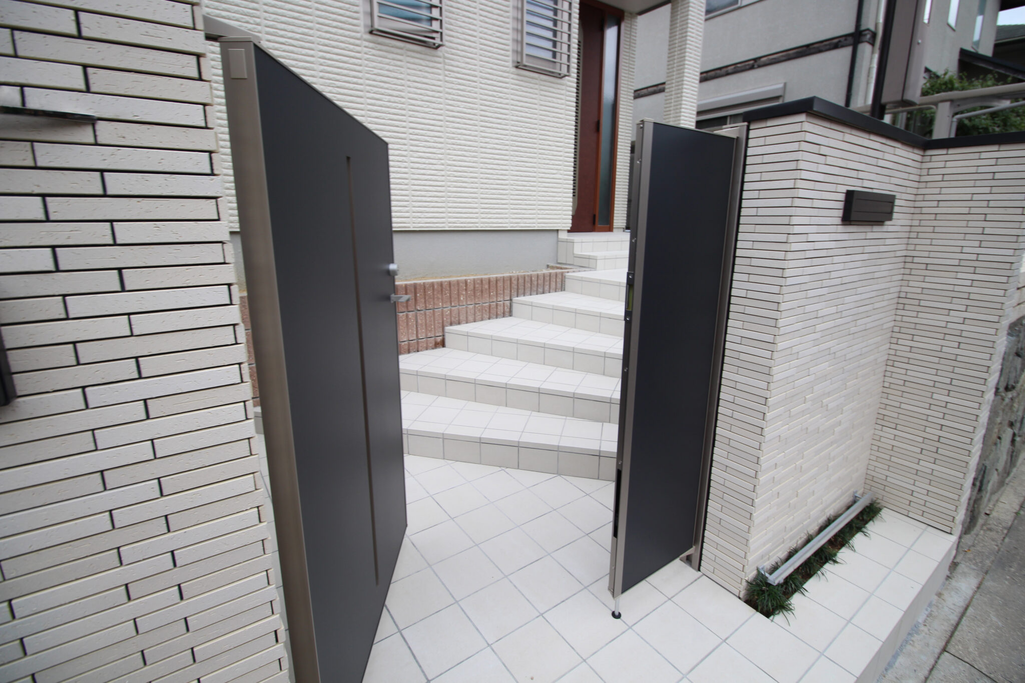建物の外壁に合わせ、壁・床タイル、レンガは白系で、門扉、フェンス、ポストなどのアルミ製品を黒系でまとめています。