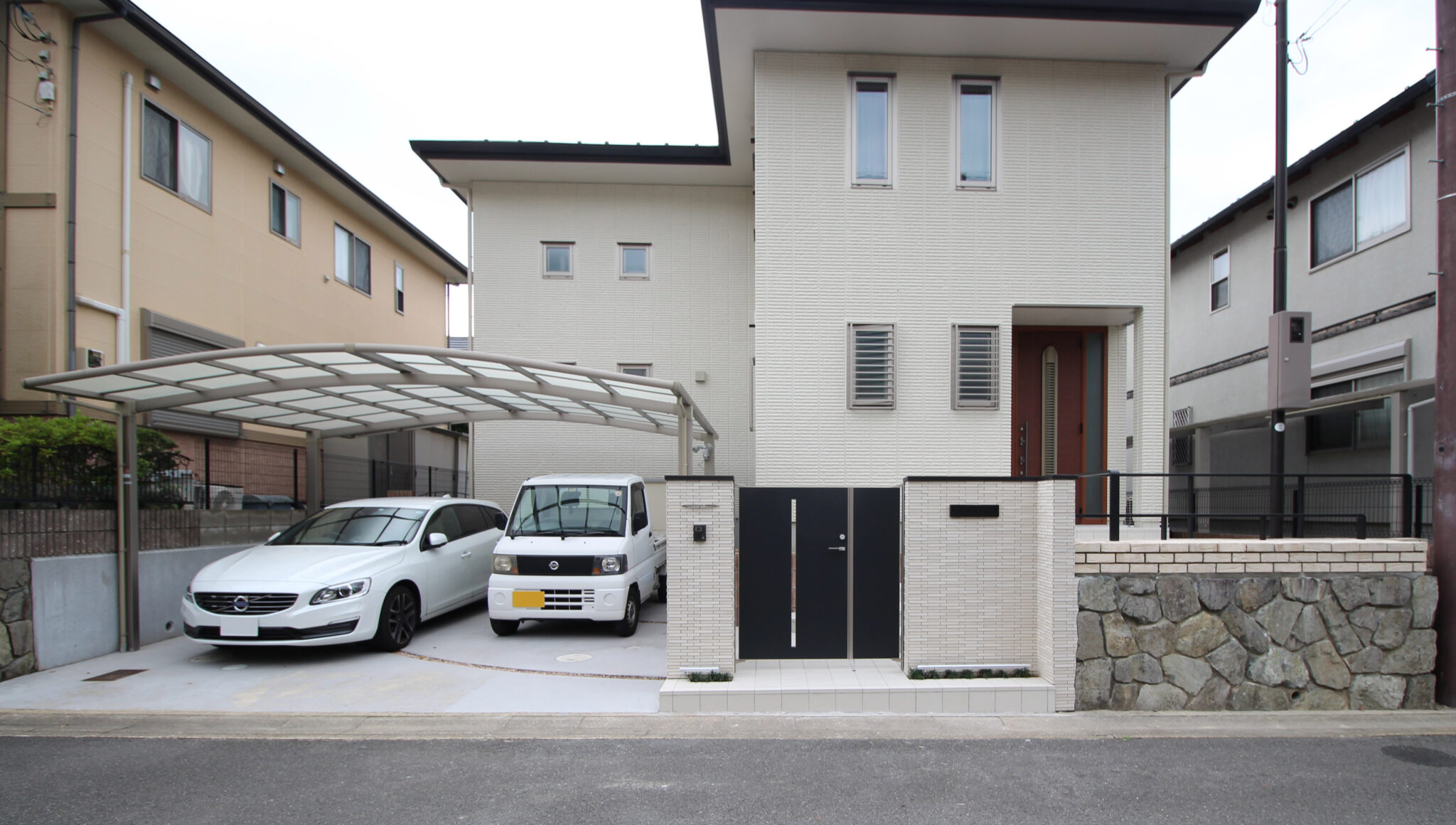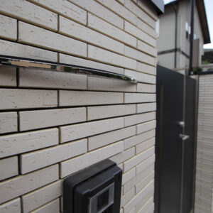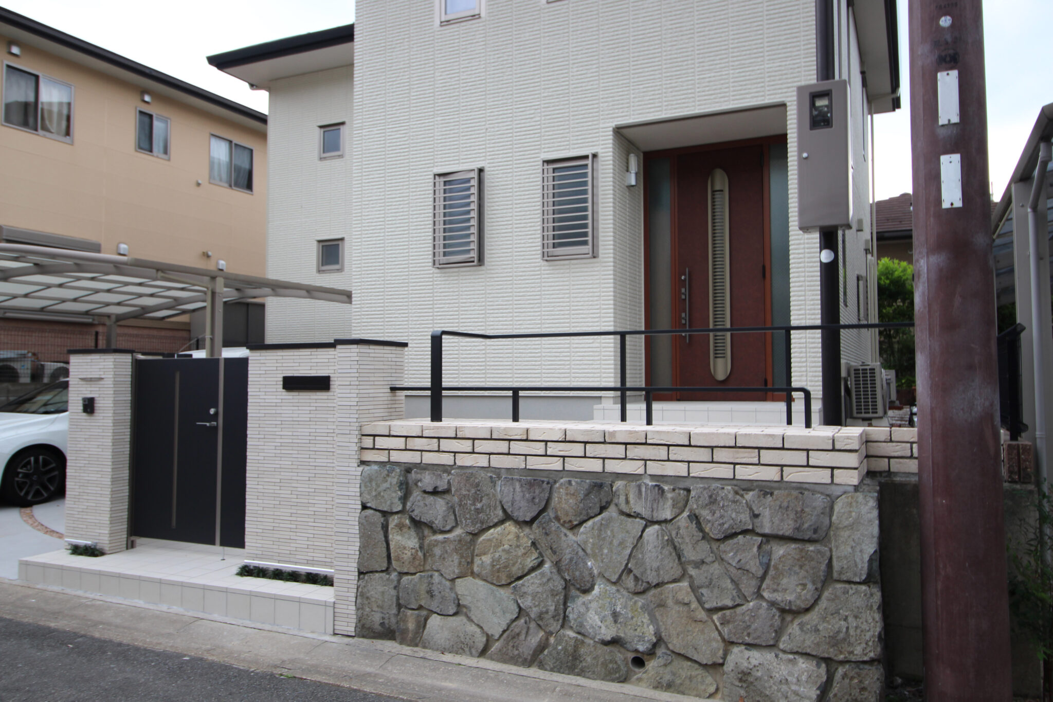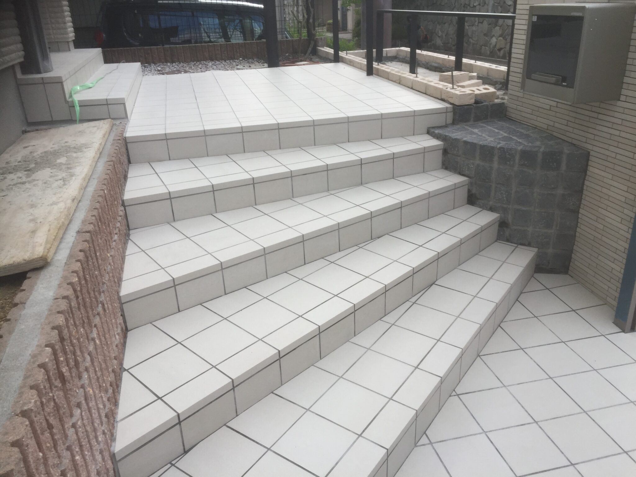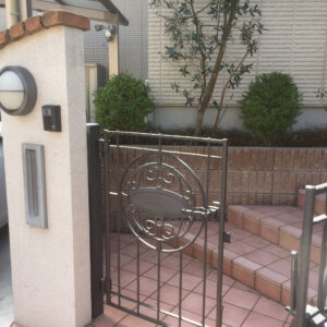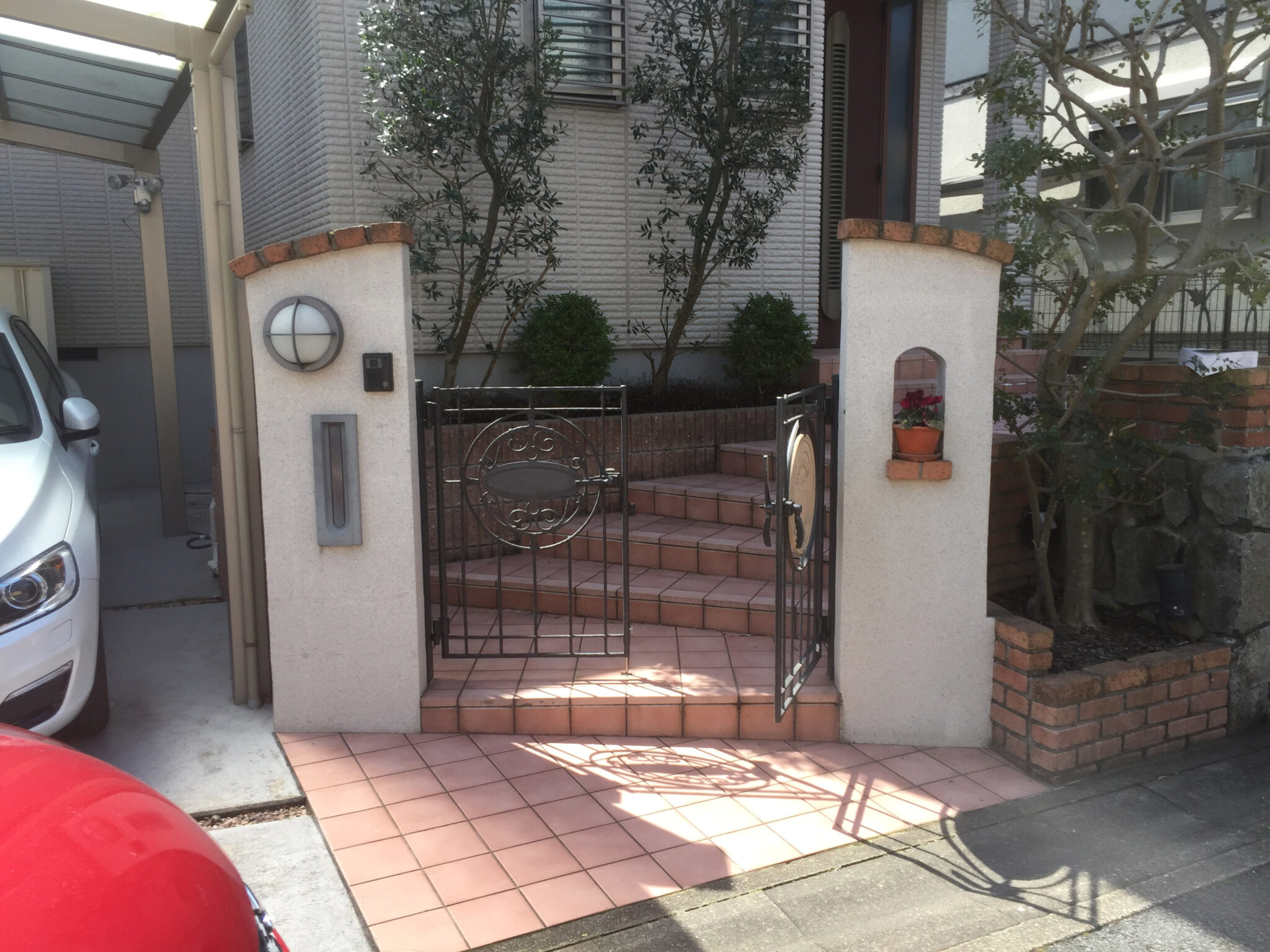 建物の外壁に合わせ、壁・床タイル、レンガは白系で、門扉、フェンス、ポストなどのアルミ製品を黒系でまとめています。