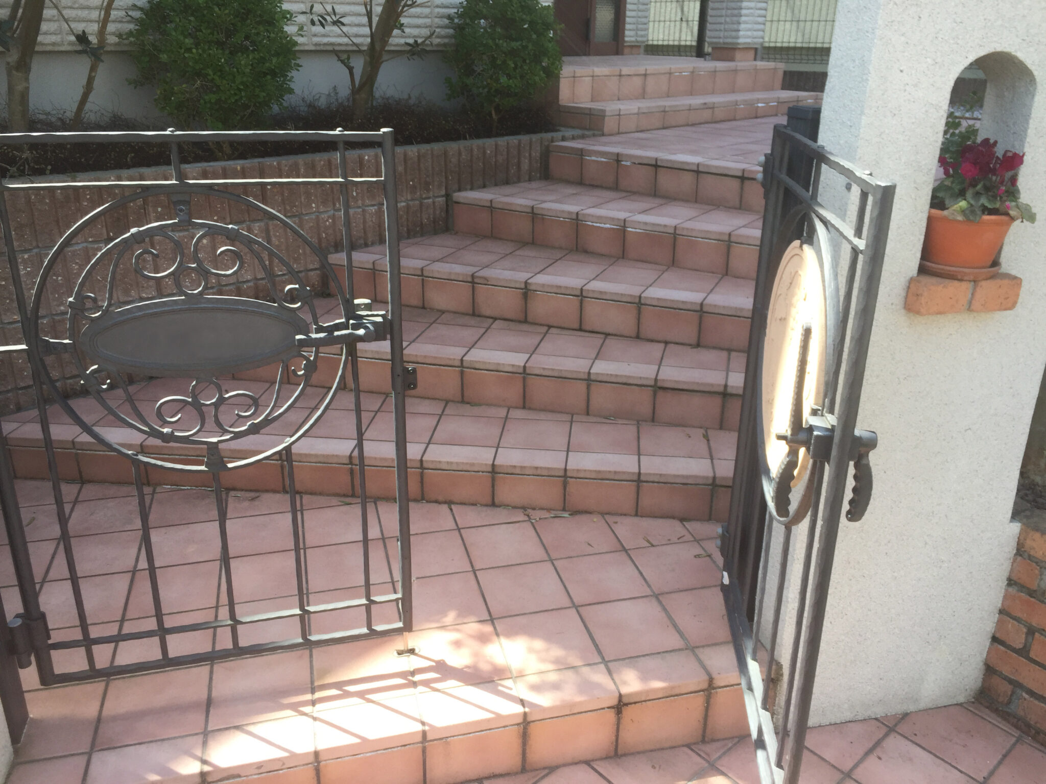 ステップの形は変えず、道路から斜めに配していた門まわりパターンを、道路や建物に対して並行に配置することで、外観を直線的なデザインへ変更し、1段目のステージに広がりと余裕を持たせました。
