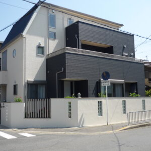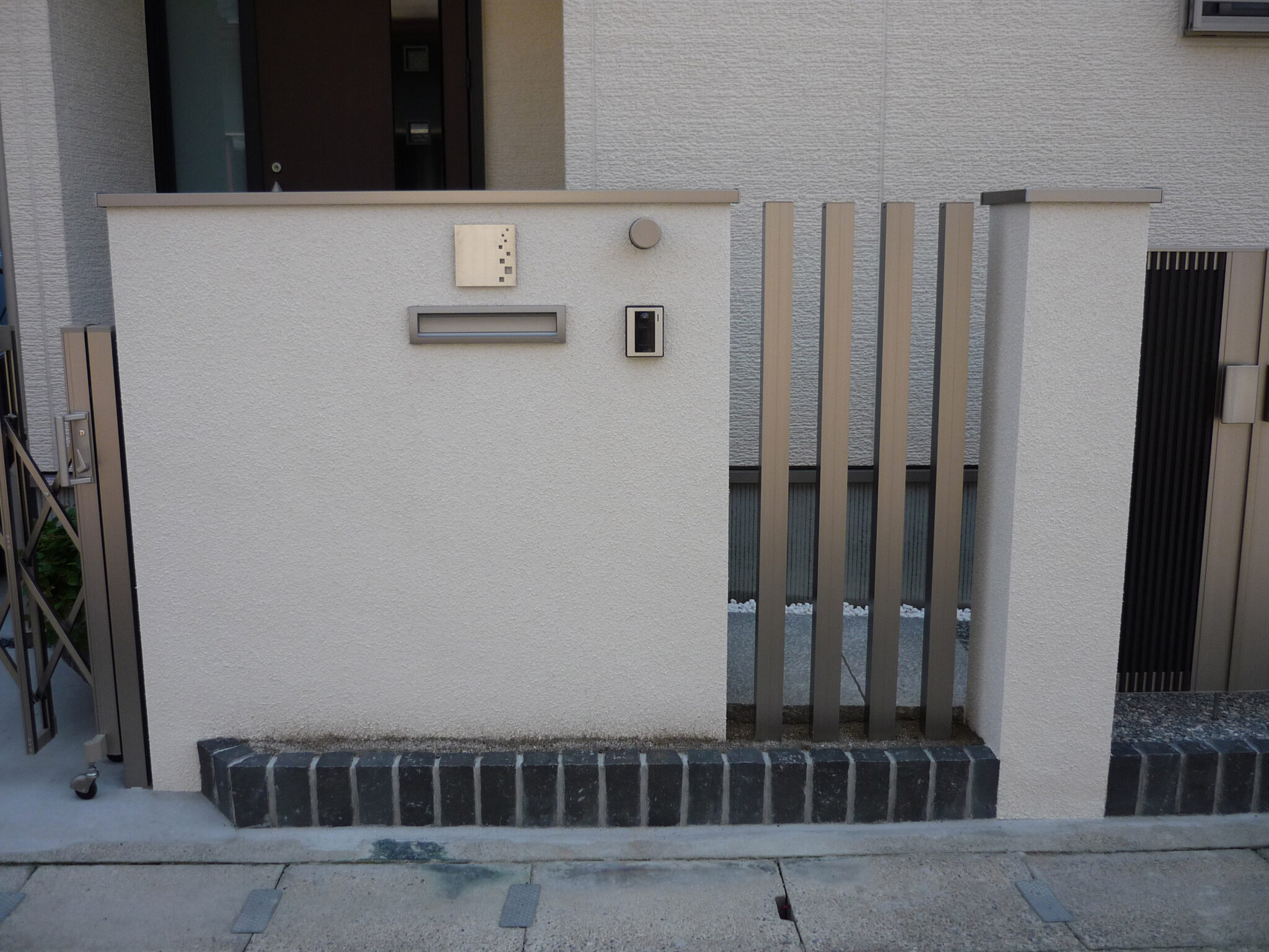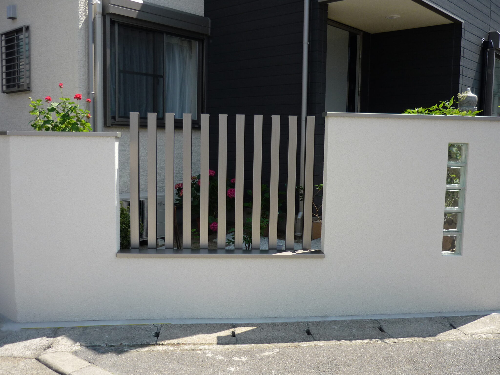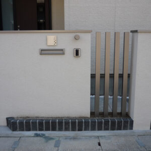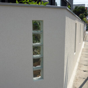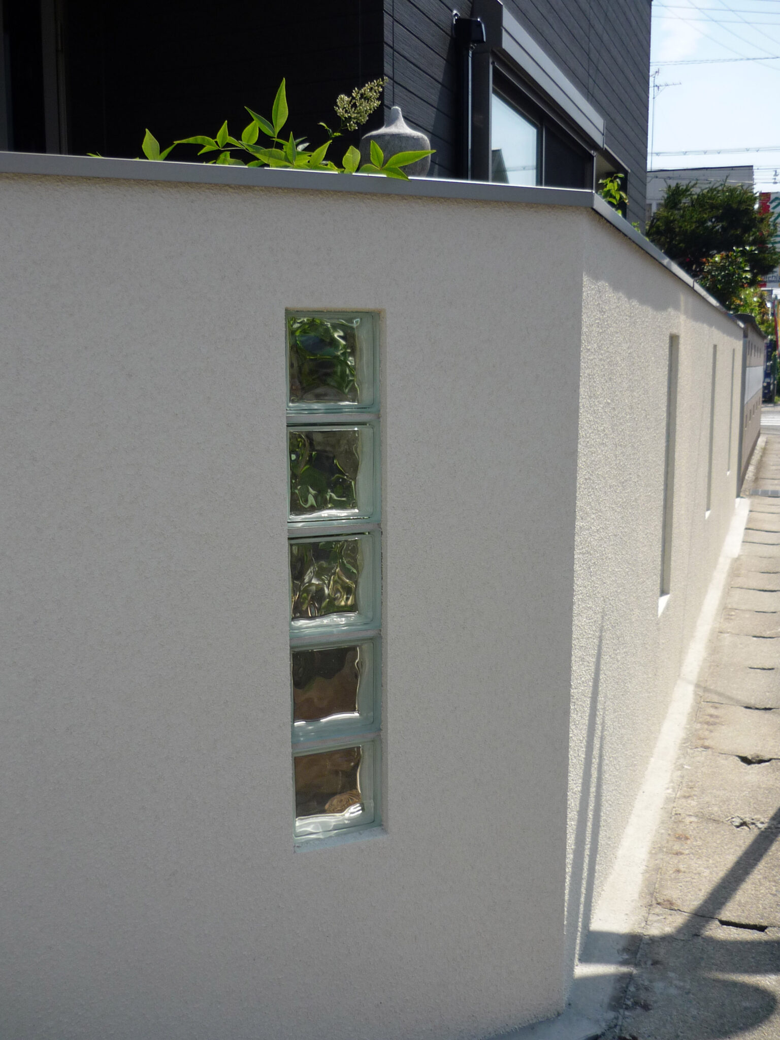 建物外観と同じ吹付の門塀に、閉鎖的にならないようアルミ角柱とガラスブロックをポイントで入れました。光と風を通す効果もあります。