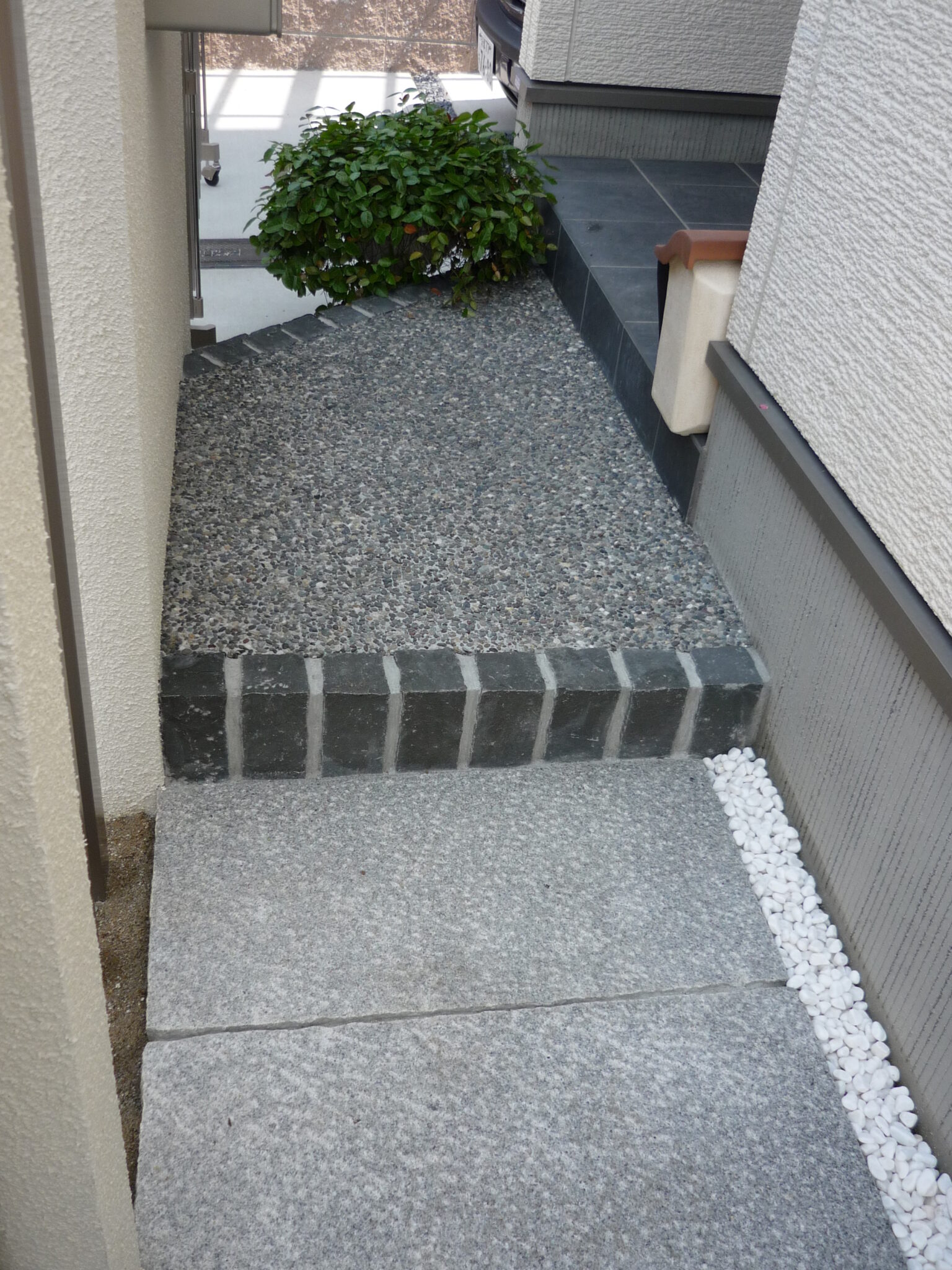 門扉を入って左側はご両親様宅へ続くアプローチ。こちらの土間仕上げは、大磯の洗い出し、グレーの板石、黒いピンコロ、白仙という化粧砂利で落ち着いた和モダンの雰囲気に仕上げました。