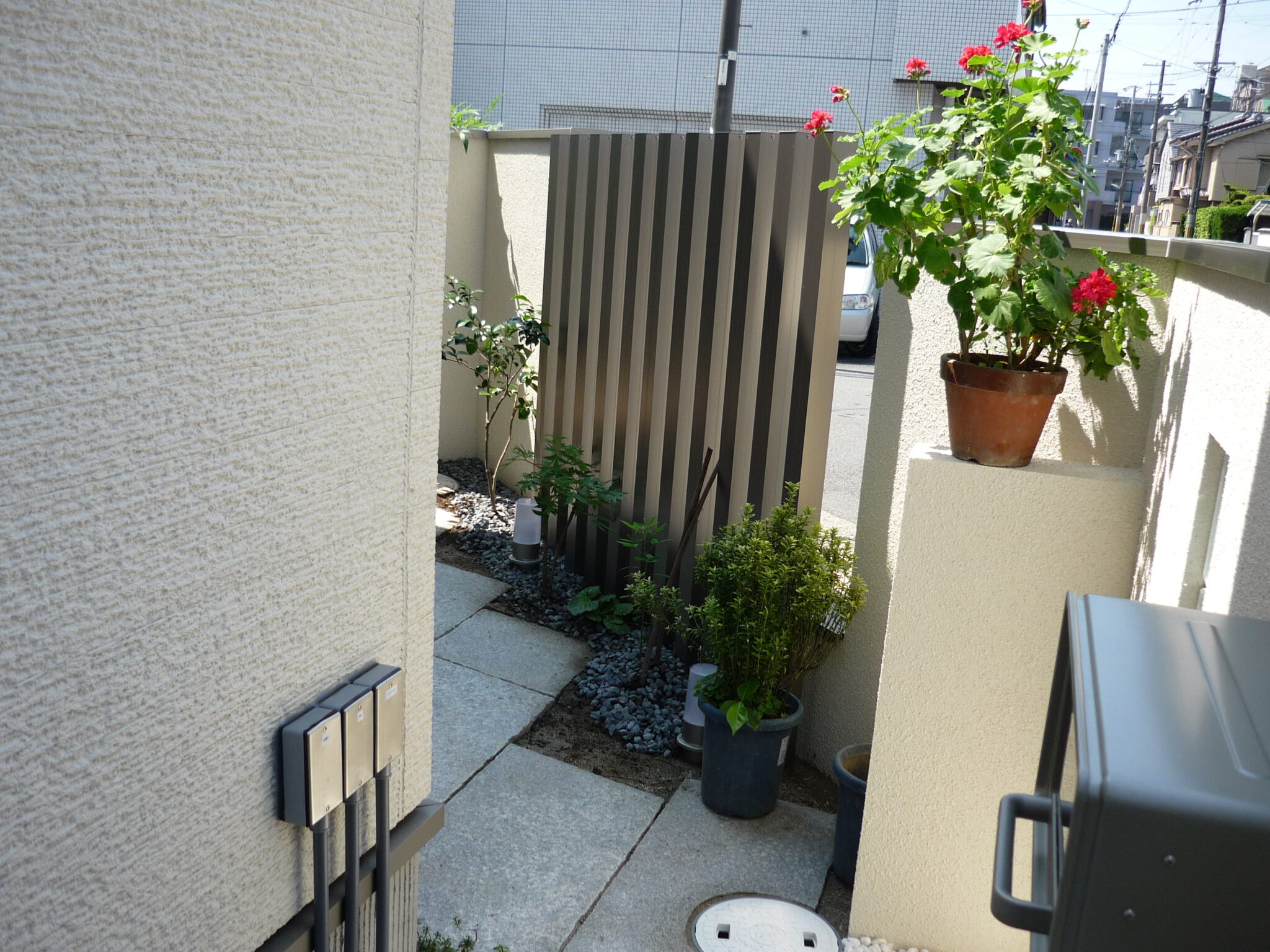 門扉を入って右側は、息子様宅へ続くL字にクランクした少し長いアプローチです。こちらの土間仕上げは、板石を敷き、足元にグリーンと照明を添えました。