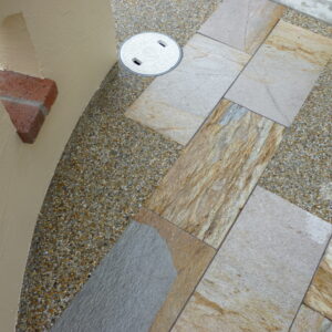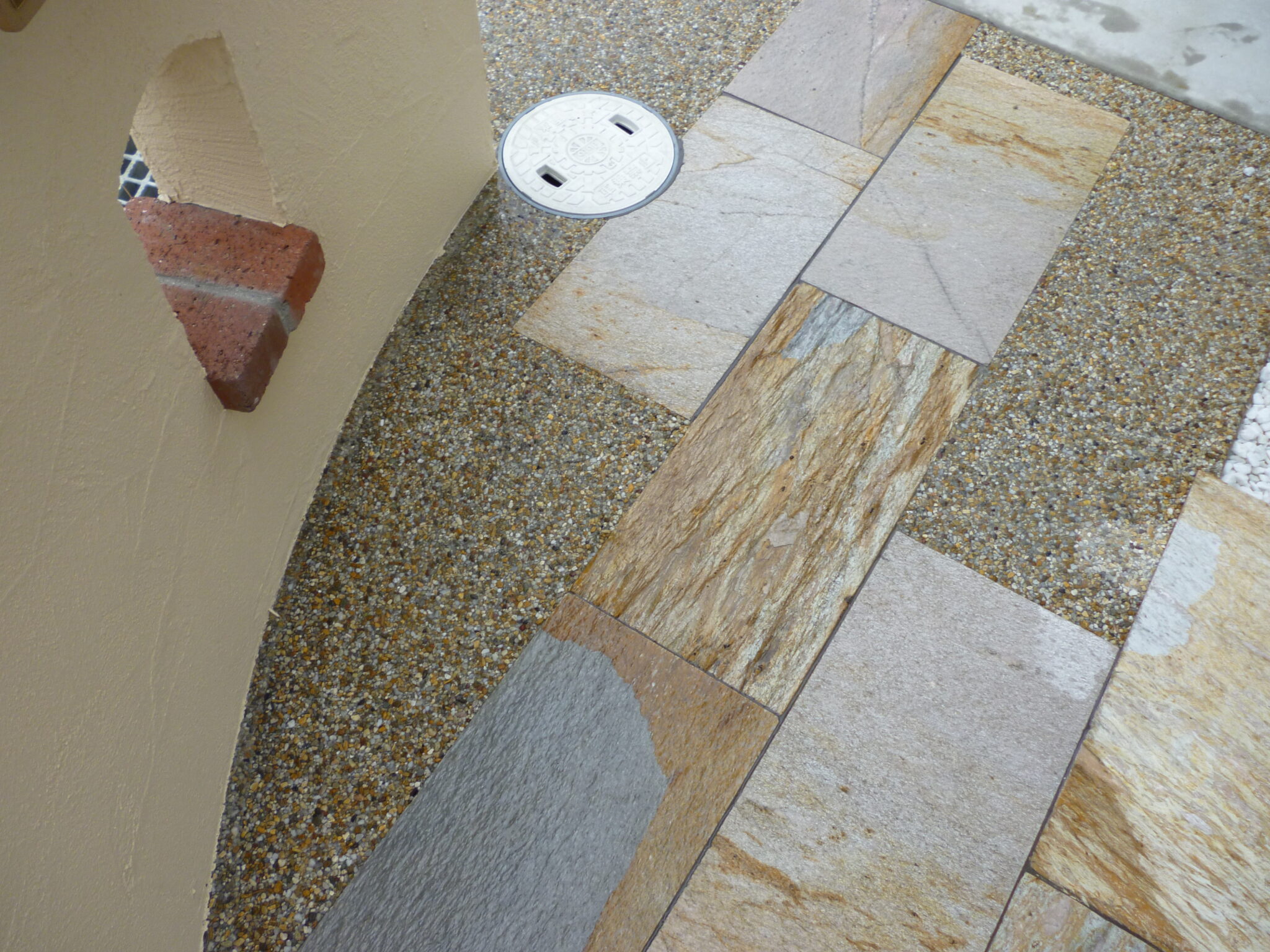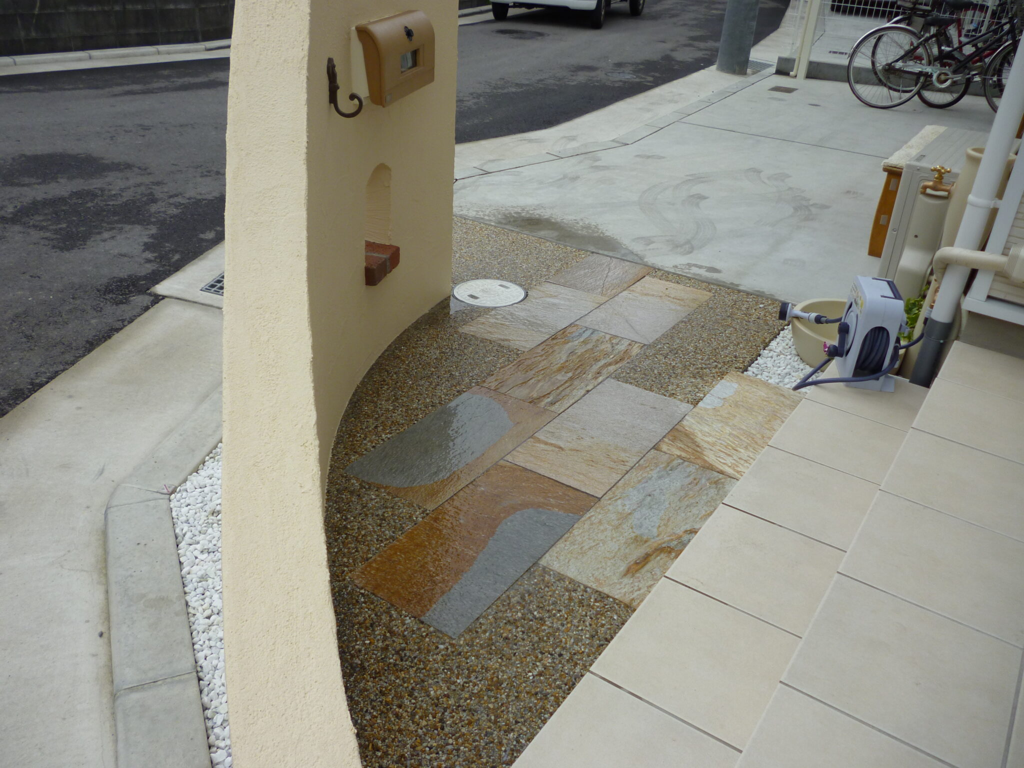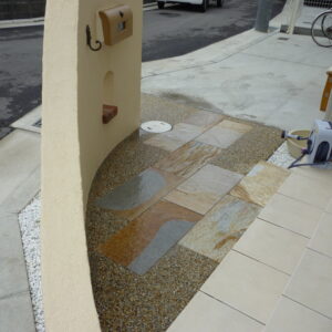 アプローチは、明るい茶系の洗い出しと、色彩がきれいな天然石の方形の石を組み合わせることで、鮮やかな印象となっております。