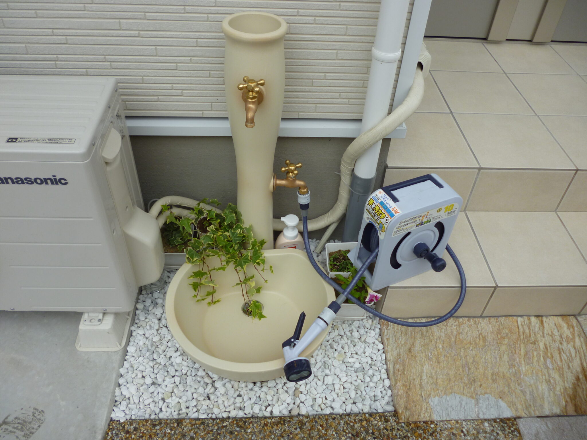 サッカーに夢中なお子様が泥だらけで帰ってきたときに、外でササっと泥を落としてから洗濯できるよう洗い場を設けました。