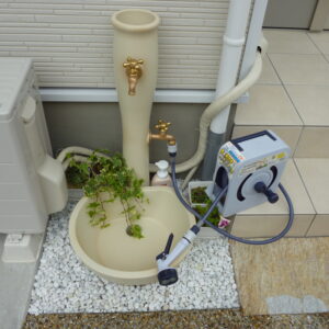洗い場が玄関横に位置しているため、門柱と同系色のナチュラルな水栓柱を採用し、空間に一体感を持たせています。
