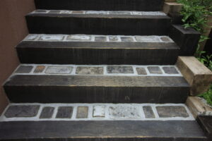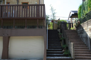 掘り込み式ガレージのあるお宅で、かなりの段数があるアプローチですが、アンティークレンガと枕木を用いて優しく自然な雰囲気に仕上がりました。