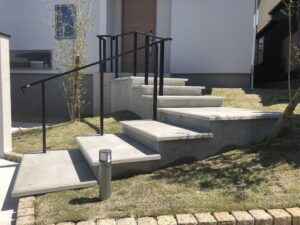高低差のある敷地で広さに余裕がある場合は、ブロックなどで土留めをせず法面仕上げ(傾斜をつける仕上げ)にするのもひとつの手法です。