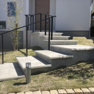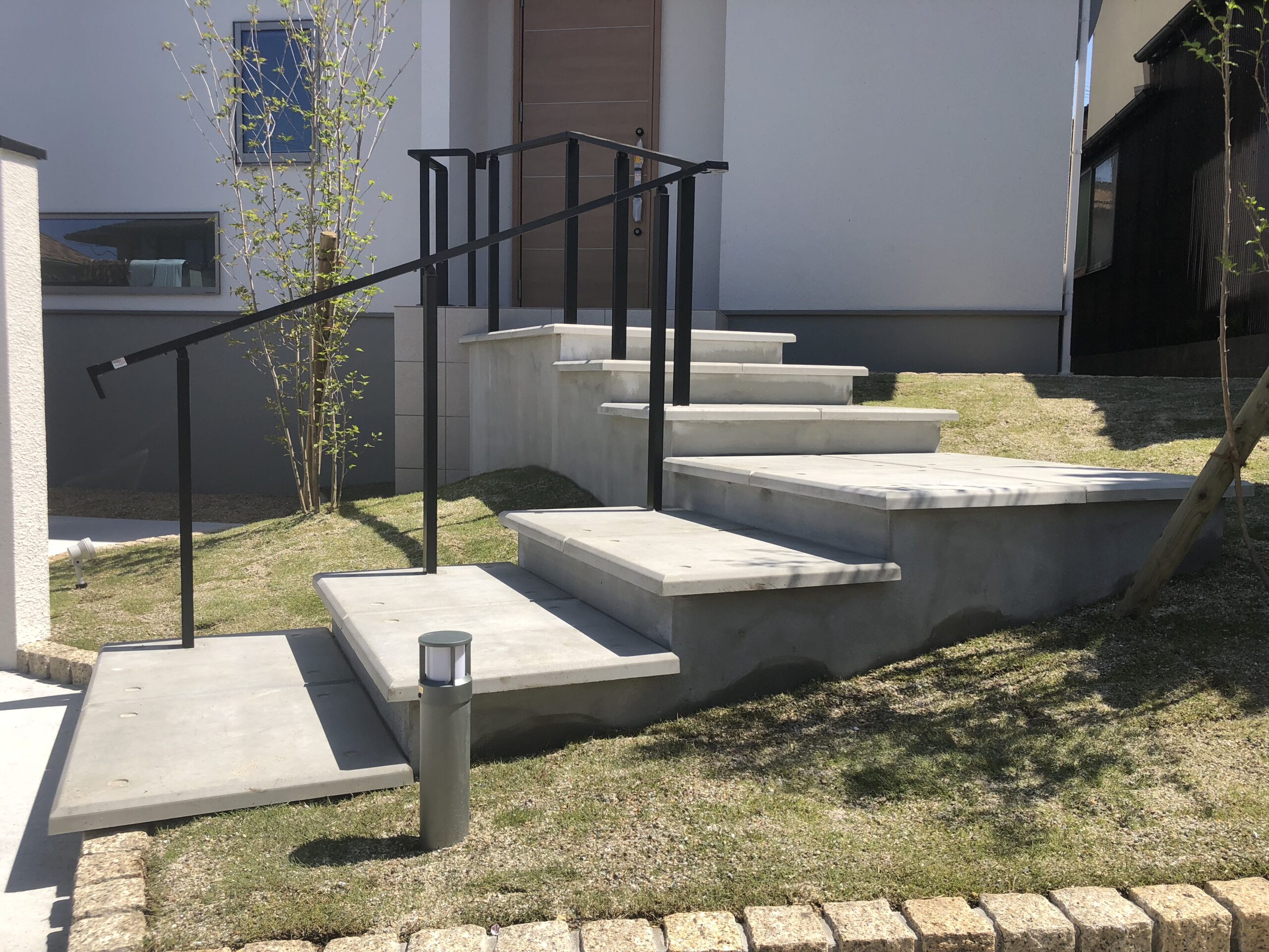 芝生と人工素材のコントラストがつき、アプローチ階段に対して芝生エリアの傾斜面が下がっていることで、階段が浮いているような印象となっております。