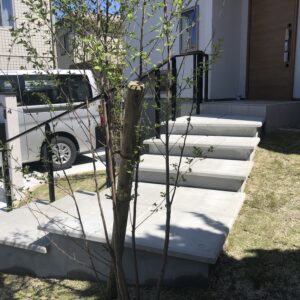 開放的なアプローチで「あまり凝ったことはしたくはないけれど見る人にキレイだなぁと思ってもらえるようなエクステリアをつくりたい」というご希望から始まった外構計画です。