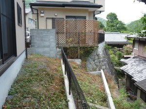 法面は使いづらい上、雑草処理などの管理が大変とのこと。下の土地との高低差は2m以上あり、雑草刈りで転落したら大変です。