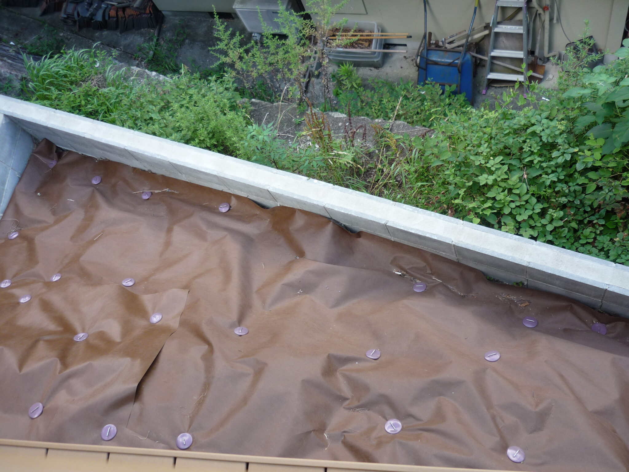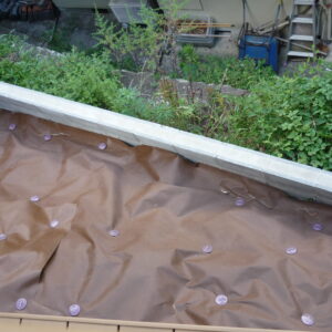 まず、表面の雑草・土を撤去し、防草シートを敷きました。