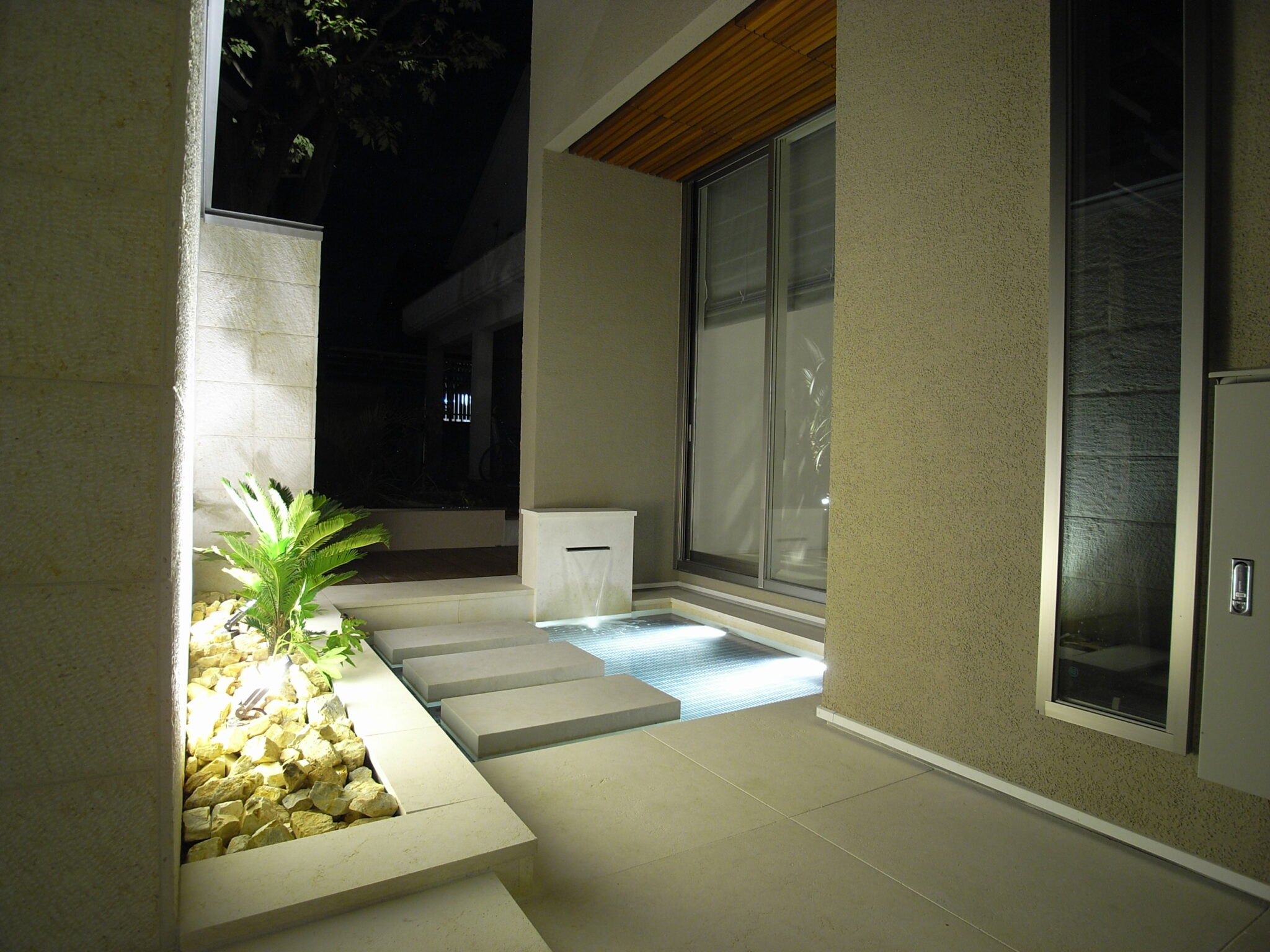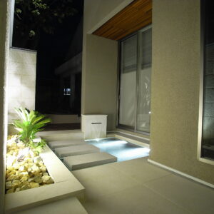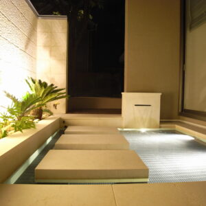 間接照明が美しく反射する水盤。まるでホテルに訪れたようなワンランク上の幻想的な雰囲気を演出し、昼間とは全く違う表情を庭に与えてくれます。