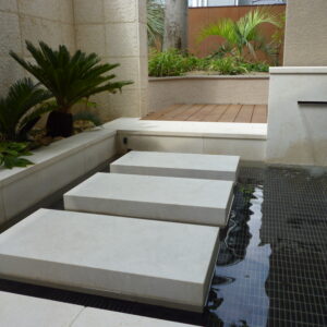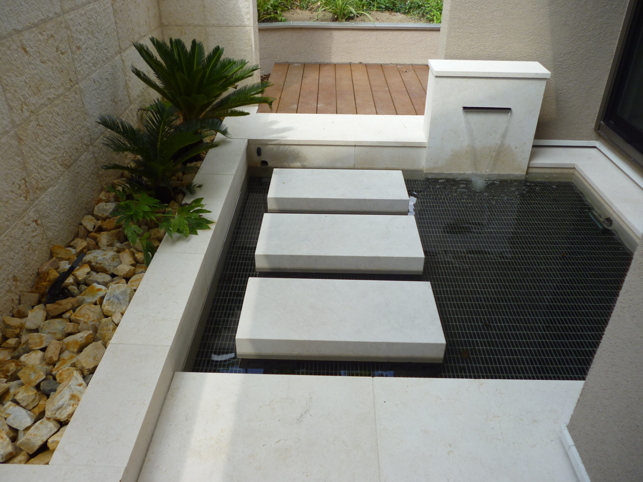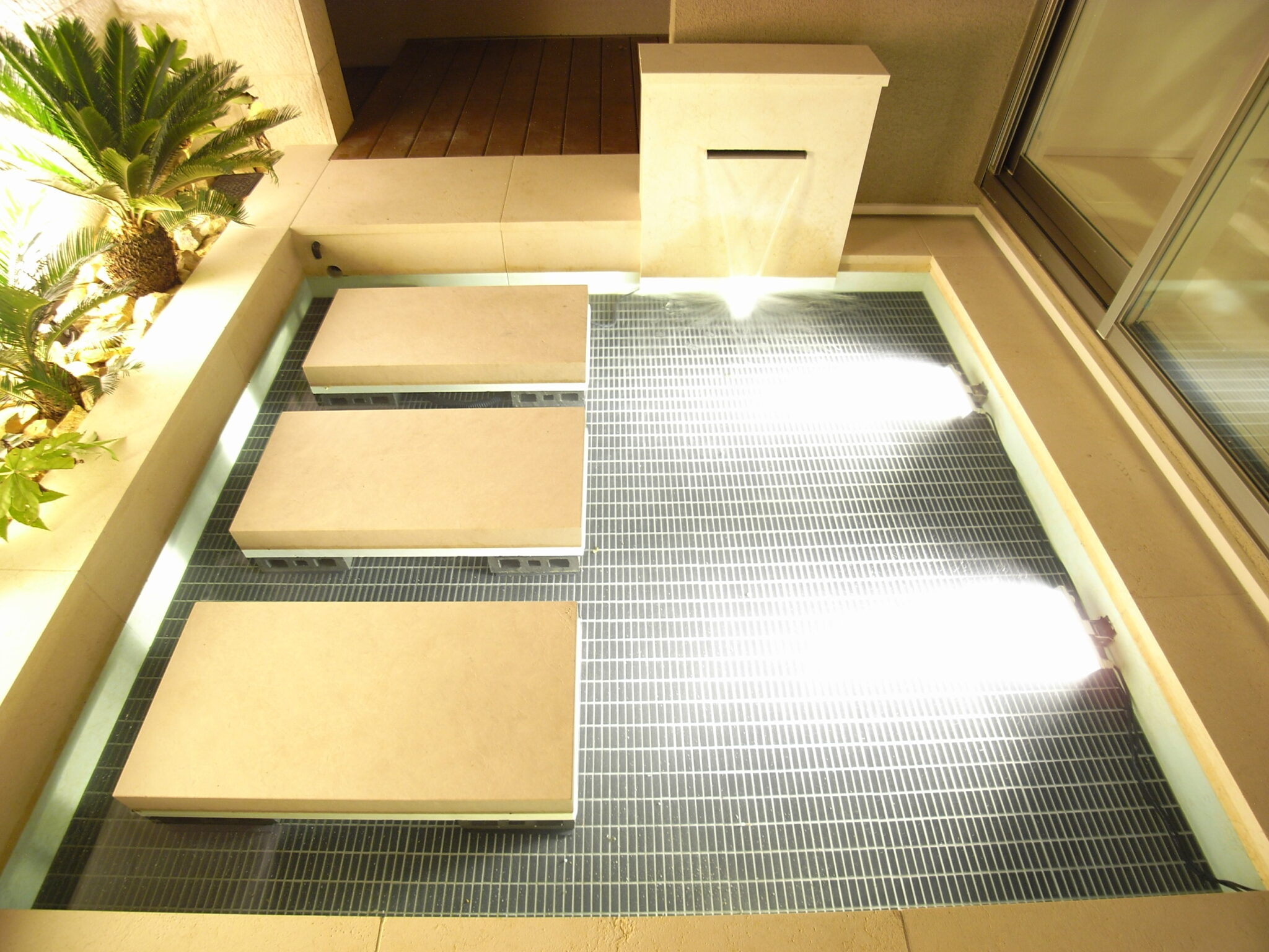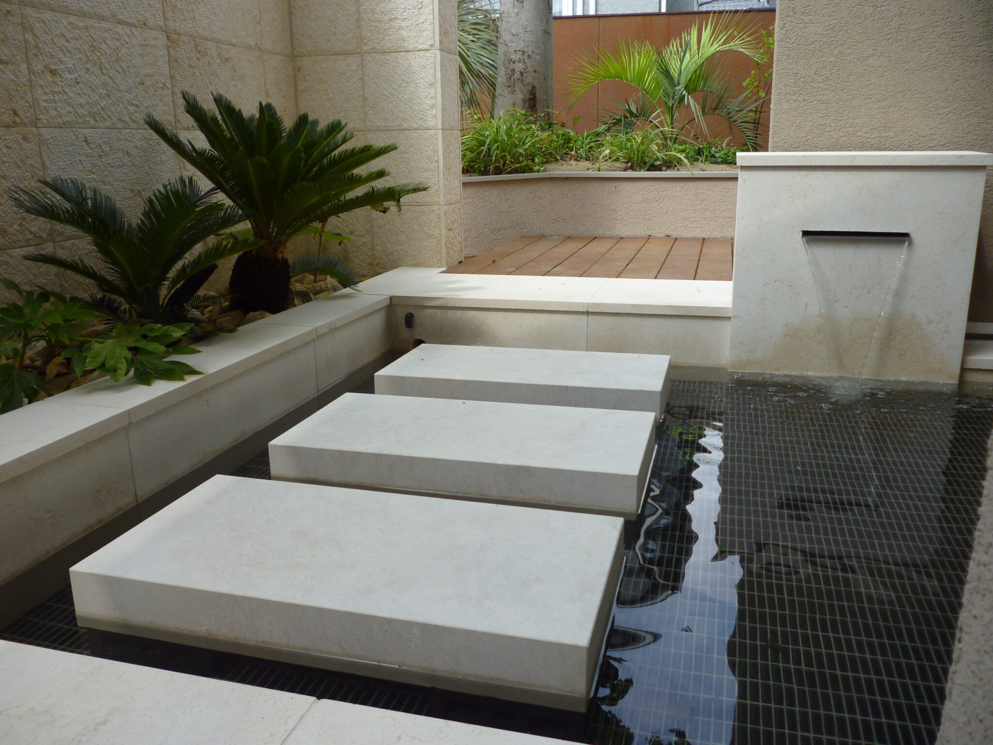 中庭をリゾート感溢れるラグジュアリーな空間にしたいとご依頼いただき、水盤と壁泉を使ったウォーターガーデンを施工させていただきました。