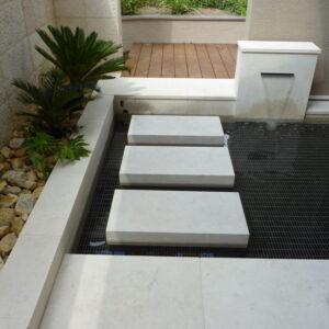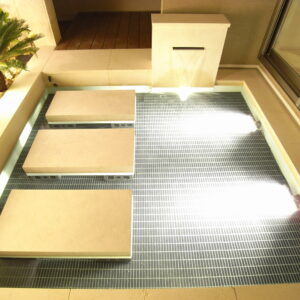こちらの中庭は、手前のアプローチから奥のデッキスペースへ繋がっているため、水盤には飛石を浮かべ、歩けるように計画しました。